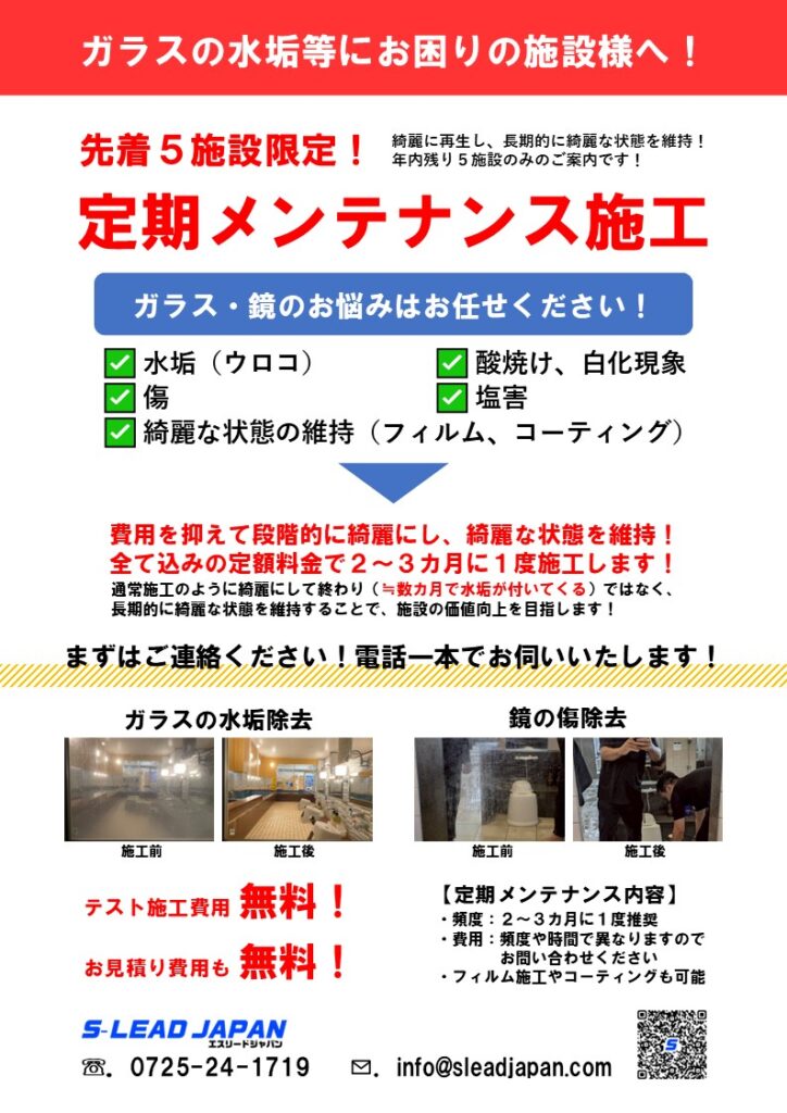ガラス・鏡の水垢でお困りのホテル・スーパー銭湯・銭湯・介護施設・商業施設様等必見!