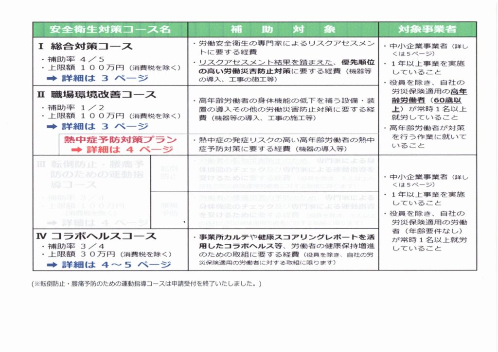 高年齢労働者の労働災害防止のための設備改善や、専門家による指導を受けるための経費の一部を補助します。