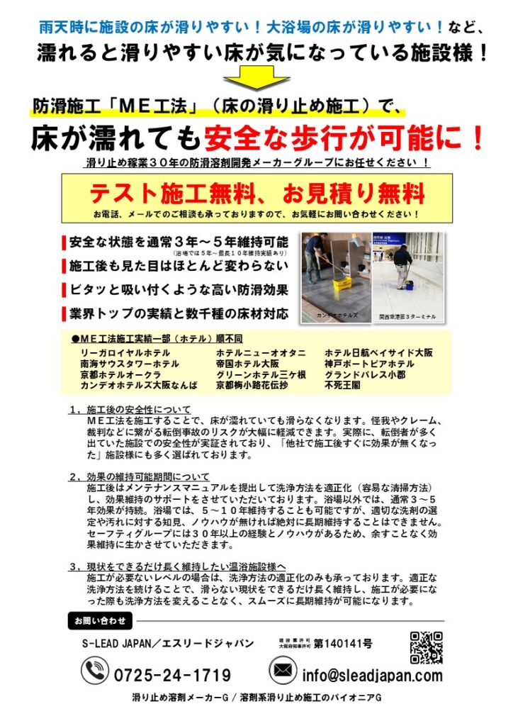 2025年9月19日 / 最終更新日時 : 2025年9月19日 sleadjapan 床の滑り止め | ブログ 知っていますか?タイル・石の床材に最適!景観が変わらないこんな滑り止め施工が有る事を・・・ 転倒事故防止対策! 景観が変わらず滑りが止まり安全性UP! 施工は、表面に樹脂や骨材を塗ったり散布しないので景観は変わりません。